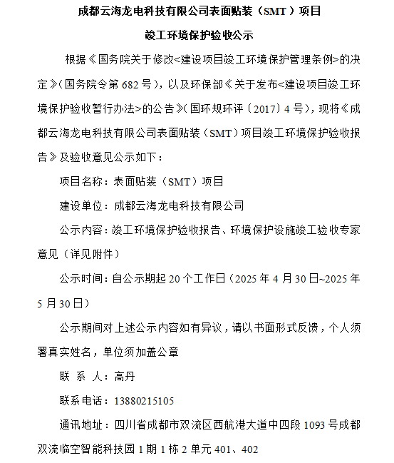 成都云海龍電科技有限公司表面貼裝(SMT)項目 竣工環境保護驗收公示